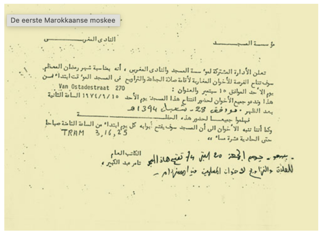Uitnodiging voor de feestelijke opening van de Al Kabirmoskee op zondag 10 september 1974. De uitnodiging is ondertekend door secretaris Abdelkabir Tamir. Bron: Historisch Beeldarchief Migranten (https://iisg.nl/hbm/marokkaanse_pioniers/echarrouti_08.php )
