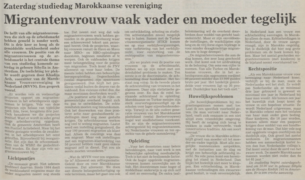 Op 19 mei 1982 werd de Marokkaanse Vrouwen Vereniging Nederland (MVVN) opgericht, de oudste nog actieve organisatie voor Marokkaanse vrouwen in Nederland. Khadija Arib, die later voorzitter van de Tweede Kamer zou worden, was een van de oprichters en de eerste voorzitter. Andere bekende voorzitters zijn Nora Azarkan, Fenna Ulichki en Ikram Chiddi.